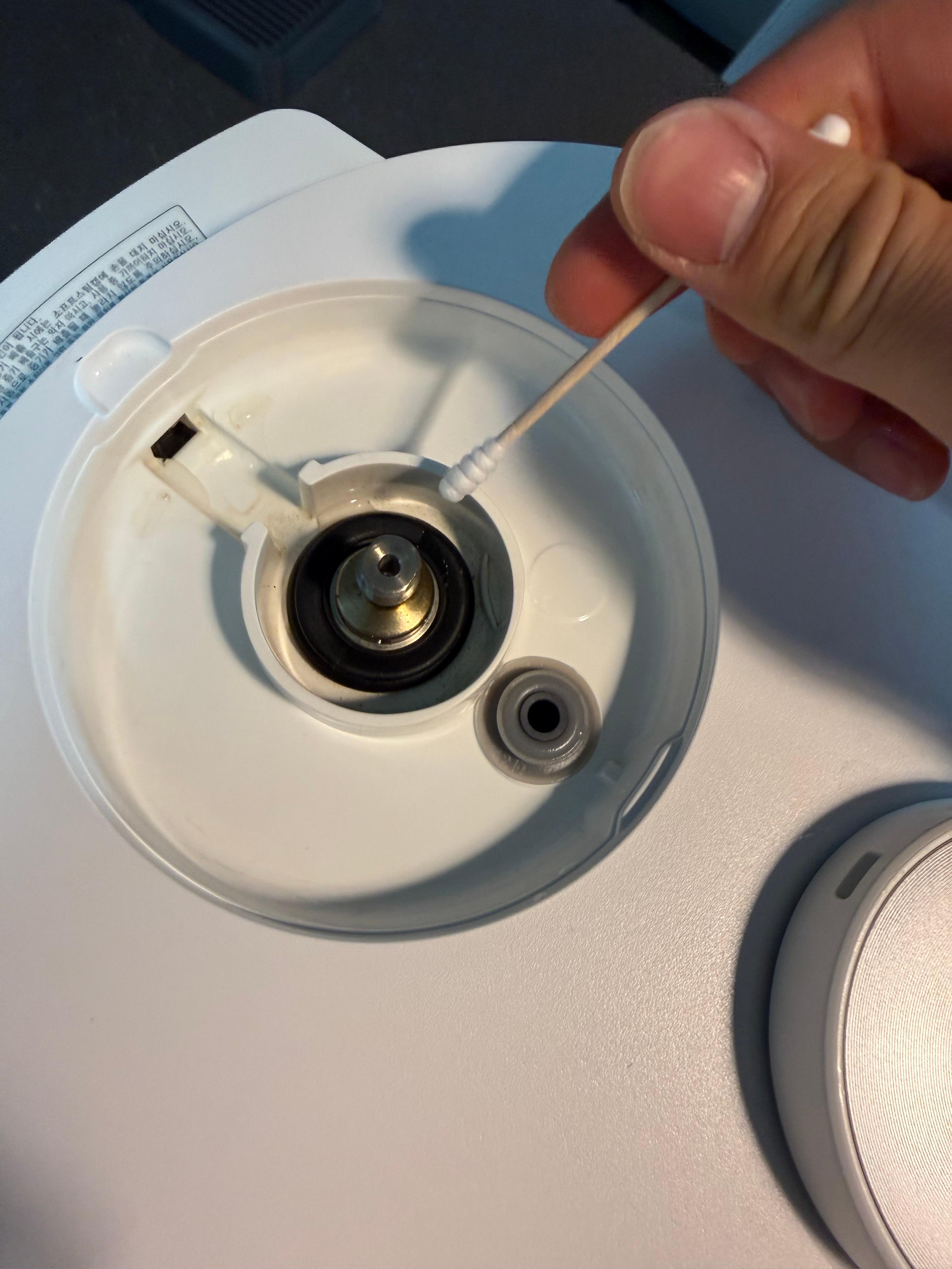 증기 배출구 주변으로 물 때가 상당하므로 면봉을 활용해서 닦아주세요.