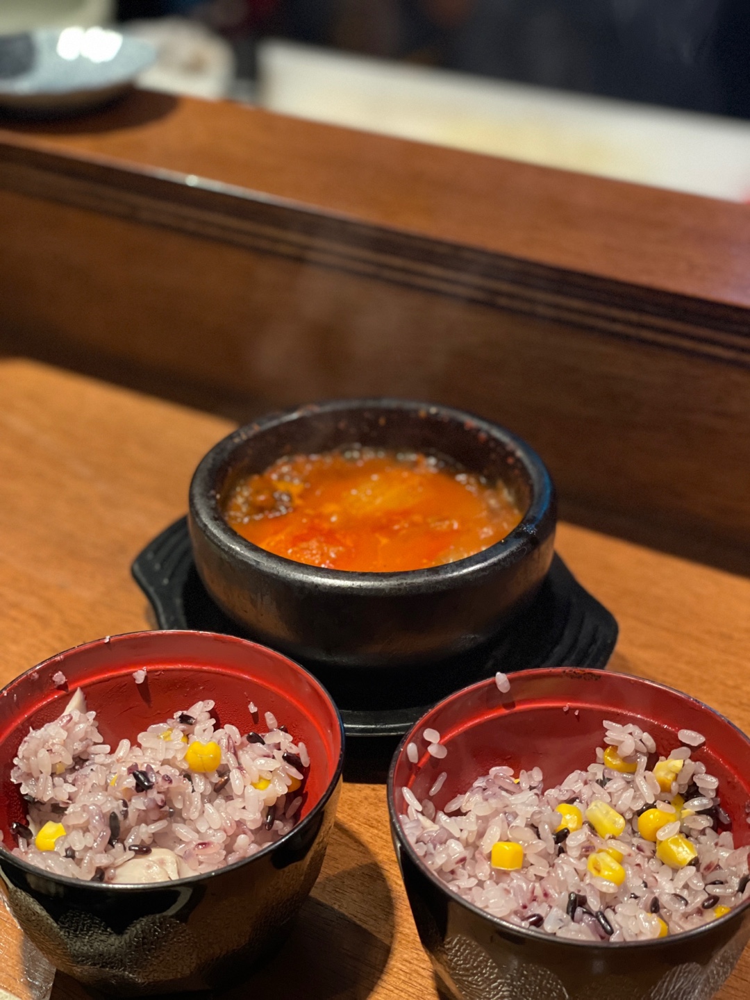 이제 식사로 김치찌개와 솥밥이 나오는데요.